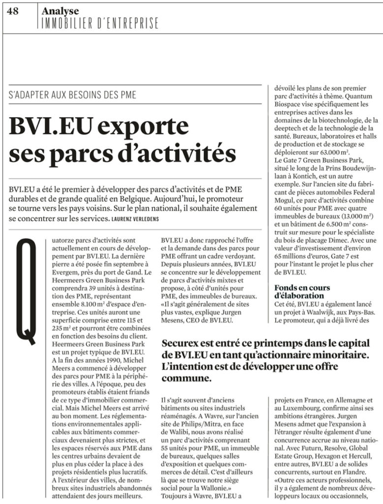 BVI.EU a été le premier à développer des parcs d'activités et de PME durables et de grande qualité en Belgique. Aujourd'hui, le promoteur se tourne vers les pays voisins. Sur le plan national, il souhaite également se concentrer sur les services.